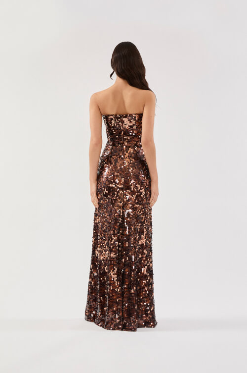 Vestido longo em paetê marrom mescla, com decote tomara que caia. Modelagem impecável. Corpo estruturado com barbatanas embutidas para marcar a cintura e sustentar o busto. Saia com caimento ideal para alongar a silhueta.