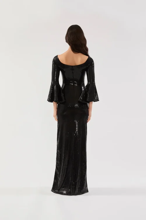 VESTIDO LONGO DECOTE CANOA MANGA BOCA DE SINO PAETÊ PRETO